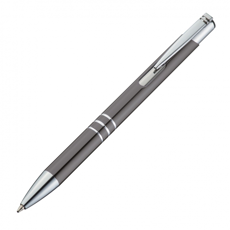 Description Stylo en métal avec 3 anneaux décoratifs et une grande mine à encre bleue. Gravure laser à côté du clip. Diam. 10 |