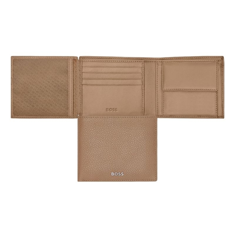 Description Ce portefeuille trifold doté d'une pochette à monnaie est réalisé en cuir camel marbré de première qualité, soigneusement sélectionné. Il est orné d'une luxueuse plaque de signature BOSS chromée et d'une doublure intérieure monogrammée. Le portefeuille comprend : 2 compartiments à monnaie 8 emplacements pour cartes 3 compartiments latéraux 1 fente pour la monnaie Conformément à l'ADN de la marque BOSS, il est simple, fonctionnel, élégant et minimal. |
