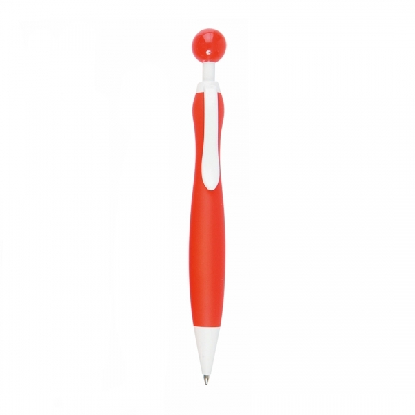 Stylo à bille à bouton poussoir de conception bicolore avec attributs blancs et corps courbe en couleurs unies. Clip poussoir original en forme de boule assortie. Cartouche jumbo. Encre bleue.