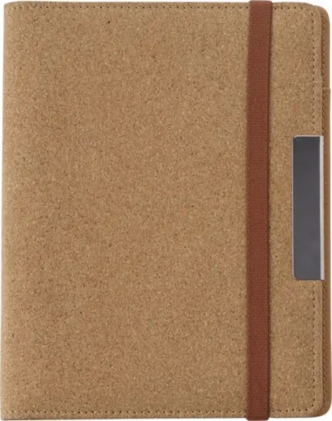 Description Conférencier A5 en liège muni d'une plaque métallique, livré avec bloc-notes, sans stylo. |