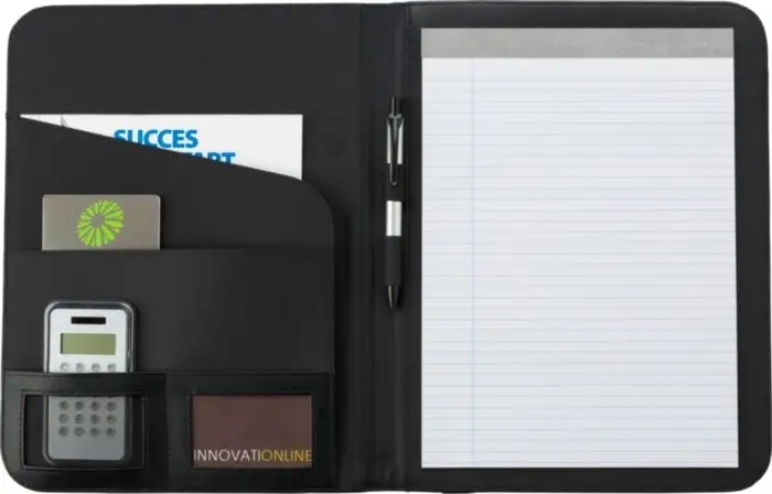 Description Conférencier A4 en PU muni d'une plaque métallique, livré avec bloc-notes, sans stylo. |