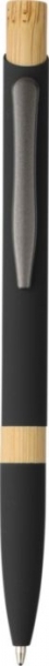 Description Stylo bille en aluminium recyclé toucher gomme, poussoir et bague en bambou, mine Bleue d'une longueur de 800 mètres. |