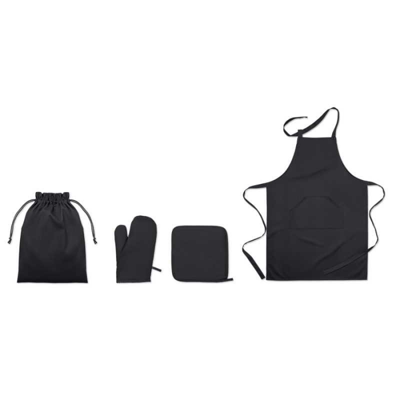 Description Nom du produit :SET AVENTAL, Ensemble en coton sergé (250 g / m2) avec tablier, manique et gant de four dans un sac à cordon., Matiere :COTTON, Dimensions : 28X3X38,5CM, Page du catalogue : 114 |