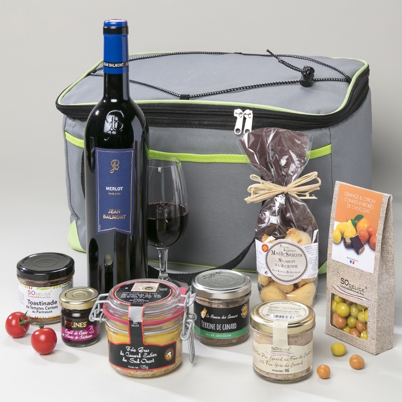 Description GLACIERE ISOTHERME 40 x 24 x 22 cm, Un Foie Gras de Canard Entier du Sud-Ouest (IGP Sud-Ouest) Bocal de 125 g, Une Confiture de Figue de Provence Orange et Pain d'Epices Bocal de 42 g, Rillettes pur Canard au Foie de Canard (avec 20% de Foie Gras) Bocal de 100 g, Une Terrine de Canard à l’Ail des Ours Bocal de 100 g, Une Toastinade de Tomates Cerises au Parmesan Bocal de 100 g, Mini Financiers aux Marrons glacés Sachet de 80 g, Oranges et Citrons confits enrobés de Chocolat Etui de 80 g, Une Bouteille de Vin de Pays d’Oc IGP « Jean Balmont » de 75 cl |