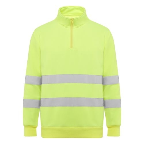 Sweat-shirt haute visibilité avec fermeture éclair et encolure haute avec mentonnière et tirette. Couverture de couture renforcée à  l'intérieur du cou. Bandes réfléchissantes horizontales sur le torse et les manches. Maille cote 1x1 aux poignets et bas.65% polyester / 35% coton, molleton gratté, 280 g/m²..Etiquette détachable.· Certification UE selon les normes : EN ISO 13688 : 2013 ET EN ISO 20471 : 2013 / A1 : 2016.· Classe II