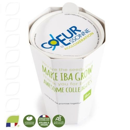 Description Vous manquez de nature, voici un petit pot étanche avec un kit de plantation et des graines au choix à poser sur votre écran d'ordinateur pour voir pousser la vie en vert !Porte plante étanche pour ordinateur, un bel objet à personnaliser entièrement à votre communication qui fera son effet posé sur l'écran d'ordinateur ou tout simplement sur le bureau de vos partenaires. QUELLE EST LA COMPOSITION DU PRODUIT ? 1 Pot carton kraft étanche 60mm 2 plaquettes de terre de coco 30 mm Un sachet de graines au choix parmi une large sélection de graines communes Dimensions : Hauteur : 95mm Largeur : 62 mm Longueur : 62 mm Poids : Environ 80gr. QUELLE EST LA PERSONNALISATION DU PRODUIT ? Cache pot en carton recylcé imprimé en quadri recto et opercule, imprimé en quadrichromie recto et 1 couleur verso à votre communication. Papier issu de forèts gérées durablement avec des encres végétales et protégé par un vernis à l'eau sans solvant. Option : Réalisable en kraft + tampographie H. 10 Larg. 10 |