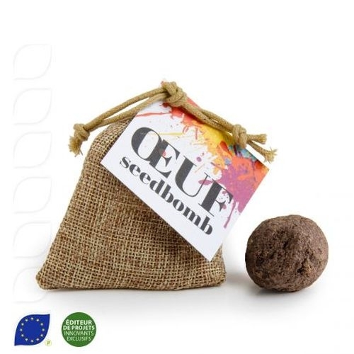 Description Ce joli pochon en toile de jute renferme une bombe de graines BIO (mélange de terre et de graines) - Issue des mouvements de guerrillas urbaines, lancez là dans la ville, terrains abandonnés, pieds d'immeubles, pied d'arbres, et vous verrez pousser de belles fleurs mellifères !Dans son pochon en toile de jute, cette petite bombe de graines est constituée d'un mélange de terre et de graines et modelée sous forme d'oeuf - Lancez là dans la nature, terrains abandonnés, pieds d'arbre, et vous verrez pousser de belles fleurs ! Quelle est la Composition du produit ? 1 seed bomb BIO : hauteur 35 mm - largeur 25 mm, composée d'un mélange de fleurs pour les abeilles et papillons.Un pochon toile de jute : 75 x 100 mmUne étiquette de 60x60mm à personnaliser Quelle est la personnalisation ? étiquette imprimée en quadrichromie R° à votre communication, sur du papier issu de forèts gérées durablement avec des encres végétales et protégé par un vernis à l'eau sans solvant. Option : Sérigraphie de votre logo sur le pochon en toile de jute Infos de marquage : Impression offset;Sérigraphie;60x60 mm Larg. 10 |