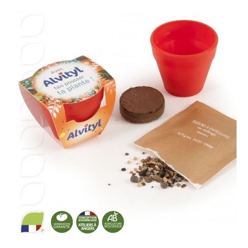 Description Comment ça germe une graine ?Idéal pour vos communications ayant pour cible les enfants ou bien petit kit de semis incassable à expédier par la poste, ce petit pot en plastique est agrémenté d'un sachet de graines et d'une plaquette de terre de coco à réhydrater pour une expérience végétale. Composition :1 pot plastique de ø 45 mm (4 coloris au choix : marron, jaune, rouge ou vert)1 plaquette de terre de coco à réhydrater,1 sachet standard de graines communes (basilic, coquelicot, tomate cerise, capucine, bleuet, tournesol, pquerette, cosmos, gazon, cresson... ou 2 bulbes de trèfle à 4 feuilles). Dimensions : Hauteur : 40 mm - Largeur : 45 mm - Longueur : 50 mm - Poids: Environ 45 gr Personnalisation : Le fourreau est imprimé en quadrichromie R° à votre communication, sur du papier issu de forèts gérées durablement avec des encres végétales et protégé par un vernis à l'eau sans solvant. Delai de livraison : 5 semaines.Délai de marquage option : 4 semaines.Infos de marquage : Impression offset Larg. 10 H. 10 |