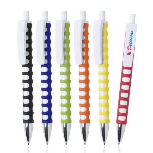 Description Stylo bille en plastique touché gomme, avec écriture encre bleue. Mécanisme poussoir. Corps avec revètement gomme ajourée au toucher doux. Clip maxi blanc pour le marquage et pointe coloris argent brillant.Stylo bille en plastique toucher gomme avec écriture encre bleue.Les prix comprennent un marquage en 1 couleur à un endroit. Diam. 11 |