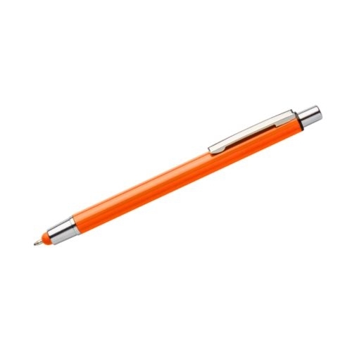 Stylo en métal avec fonction de stylet. Stylo en aluminium, recouverte de peinture de couleur vive. Embout avec une gomme spéciale permettant de naviguer sur des écrans tactiles. Encre bleue.