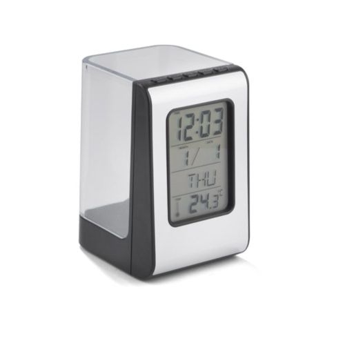 Organisateur de bureau avec compartiment, pot à stylos et l'horloge avec fonctions : calendrier, alarme, minuterie et thermomètre. Larg. 100 H. 72 Long. 64