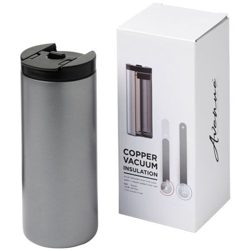 Description Un gobelet compact et durable, idéal pour le travail ou les voyages. Le gobelet dispose d'une double paroi en acier inoxydable avec isolation en cuivre, ce qui signifie qu'il maintient les boissons chaudes pendant 8 heures et froides pendant 24 heures. Le couvercle peut se verrouiller. Le design empèche également la condensation à l'extérieur du gobelet. Capacité de 360 ml. Présentée dans une boite cadeau Avenue.Acier inoxydable, Plastique PPTampographie - Devant - 20 x 70 mm - couleurs max : 4. Diam. 72 H. 165 |