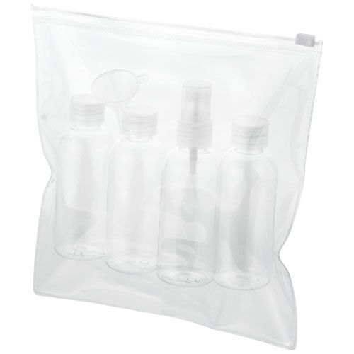 Description Pochette de voyage zippée conforme TSA. Avec 3 petites bouteilles rechargeables de 80 ml, un vaporisateur rechargeable de 80 ml, et un petit entonnoir. Les bouteilles et l'entonnoir sont emballés dans une pochette plastique, séparés de la pochette. Marquage indisponible sur les composants.PVC, Plastique PPTampographie - Devant - 55 x 55 x à˜ 70 mm - couleurs max : 1. Larg. 40 Long. 190 H. 160  |