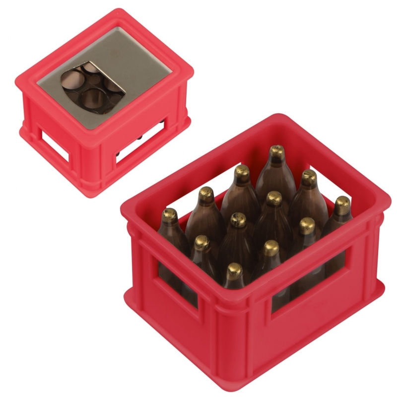 Description Décapsuleur en forme de casier à bouteilles de bière. Marquage sur larticle. |