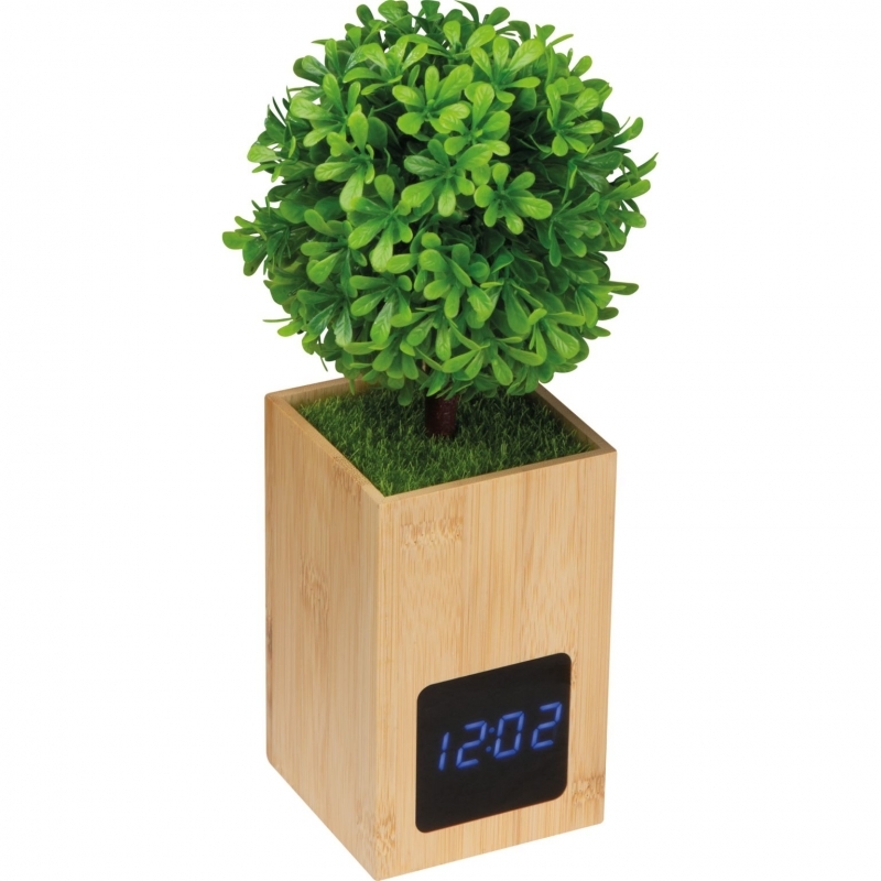 Description Bamboo Table Clock Green Feeling - larbre sur le gazon artificiel nous détent et cela rend le travail au bureau plus amusant. Les cbles sont inclus dans la livraison. Nous imprimons votre logo au laser au-dessus de lécran. Batterie non inclus : 3xAAA or USB |