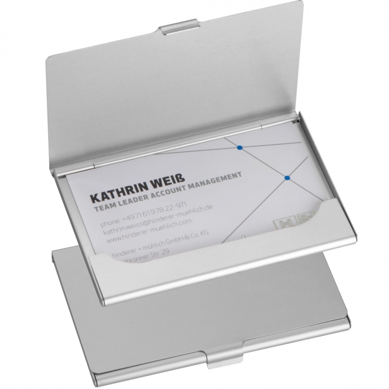 Description étui pour cartes de visite en aluminium mat. Gravure sur le devant. |