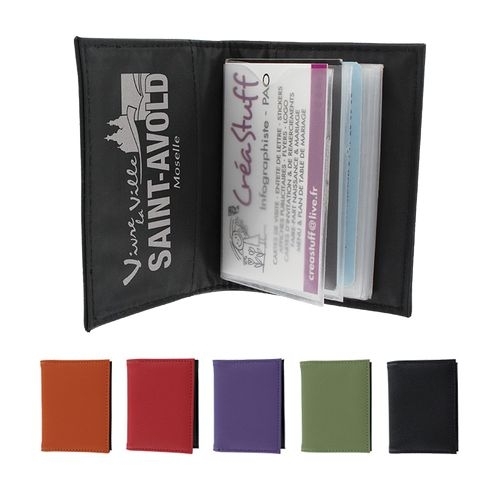 Description Porte-cartes de crédit, 20 pochettes en simili cuir haut de gamme et coloris tendances : Amande, lilas, caramel, noir, rouge. Marquage en 1 couleur à l'intérieur, ARGENT par défaut.PVC |