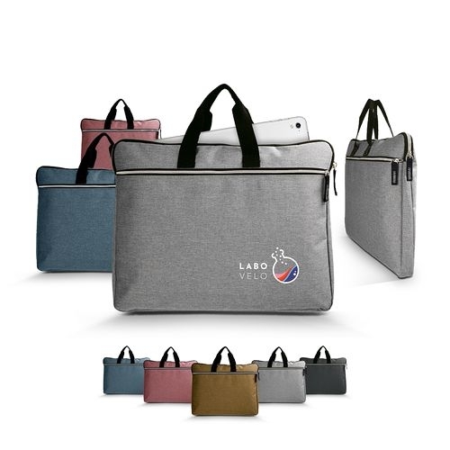 Description Sobre et fonctionnelle, cette sacoche révèle pleinement son style grace à ses teintes pastels chinées pour un look chic et citadin. Sacoche porte-documents ou ordinateur portable 15 composé d'un compartiment principal avec mousse de protection 2 faces et d'une poche zippée sur la face avant. Avec double poignées porté main. Marquage 1 couleur ou QuadriTransfert sur la poche.POLYESTER |