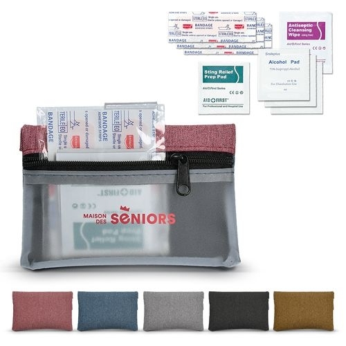 Description L' indispensable infirmerie de poche qui prend en charge les petits bobos lorsqu'on n'est pas à la maison ! Contient 3 pansements, 3 compresses d'alcool, 1 lingette antiseptique, 1 lingette nettoyante. Le petit plus : Vide il se tranfsorme en porte-monnaie. Marquage sur face transparente en noir conseillé et par défaut.600D |