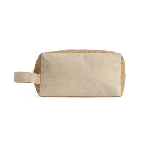 Description Trousse de toilette en coton laminé et jute. Fermeture éclair avec tirette en jute assortie.Coton et jute.21cm/11cm/6cm |