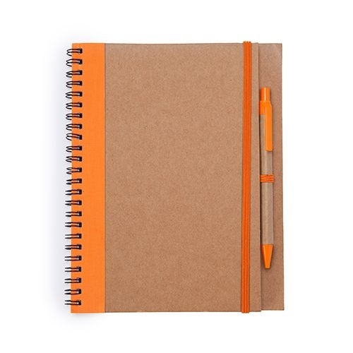 Description Cahier à spirales et couverture rigide en carton recyclé. Avec un stylo bille assorti en encre bleue. 60 feuilles.Couverture en carton recycléInformation de marquage: E(4)16,5cm/1cm/21cm |