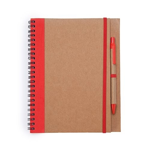 Description Cahier à spirales et couverture rigide en carton recyclé. Avec un stylo bille assorti en encre bleue. 60 feuilles.Couverture en carton recycléInformation de marquage: E(4)16,5cm/1cm/21cm |