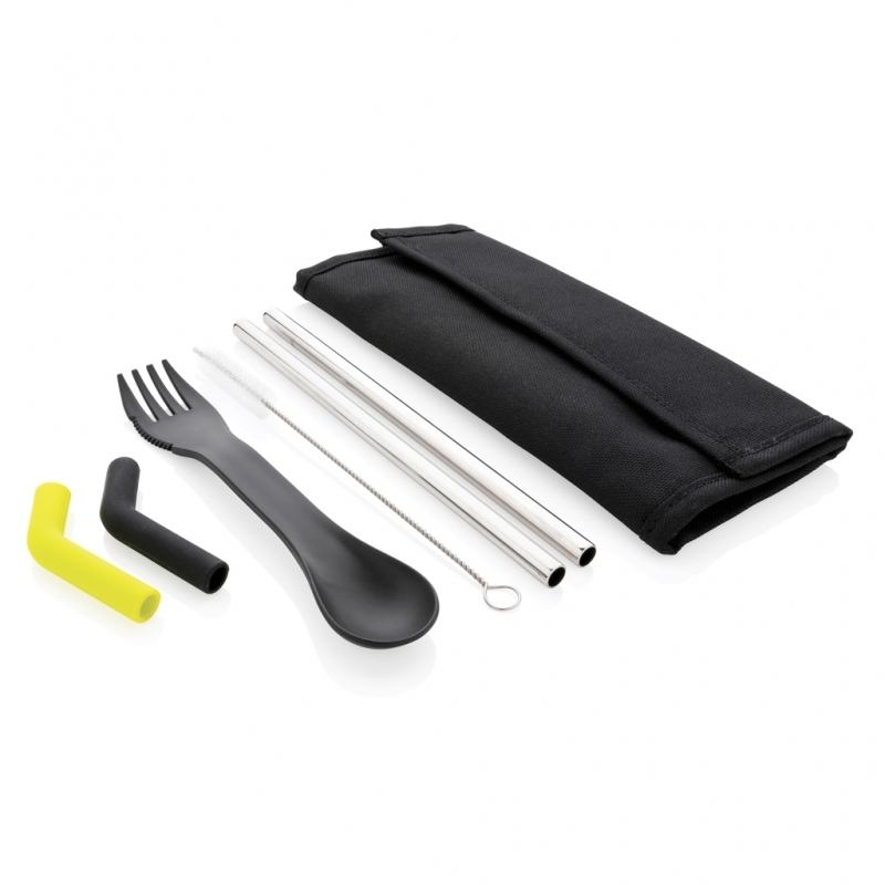 Description Set de 2 pailles en acier inoxydable avec une brosse de nettoyage, une fourchette et 2 morceaux de paille en silicone de différentes couleurs à fixer sur les pailles pour un confort optimal. Emballé dans une pochette en polyester 600D pratique et avec fermeture velcro. Sans PVC. Passe au lave-vaisselle.  |