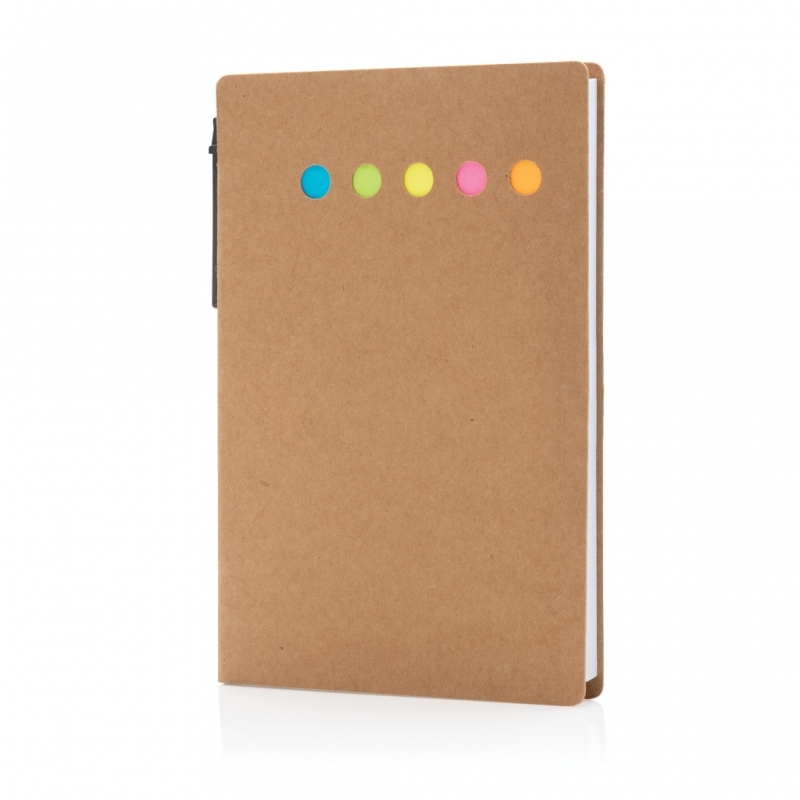 Description Carnet A6 avec une couverture kraft (350 g/m²), un grand bloc-notes contenant 50 feuilles, 4 petits et 1 moyen blocs-notes autocollants contenant chacun 25 feuilles. Papier recyclé et stylo en ABS avec encre bleue, longueur d'écriture 800 mètres. |