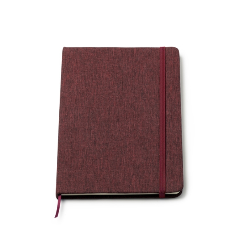 Carnet A5 avec couverture rigide en RPET. Marque-page et bande élastique. 80 feuilles.