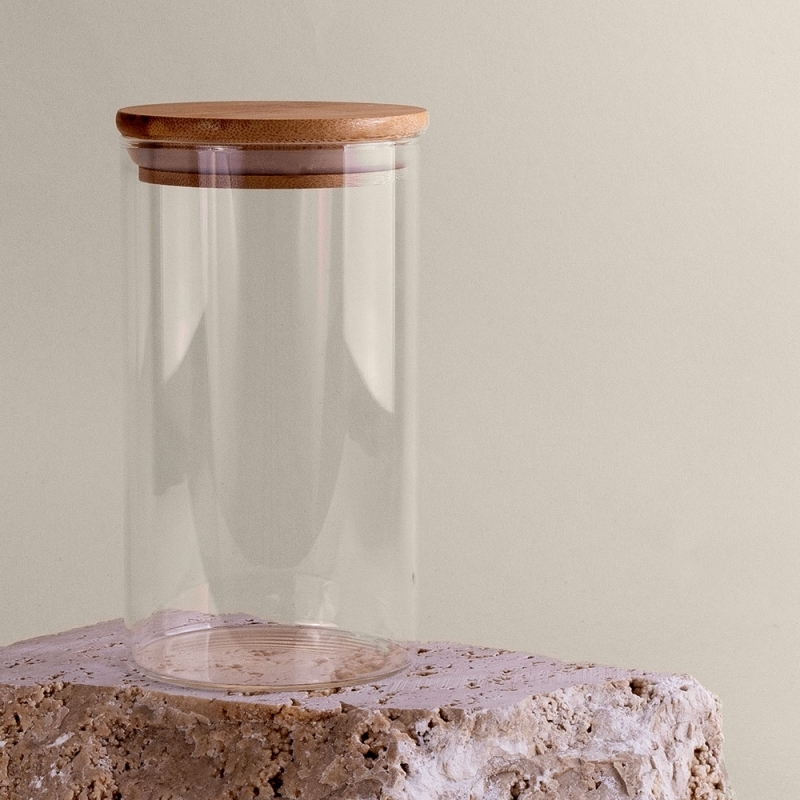 Description Pot en verre en borosilicate et couvercle en bambou, de 650 ml. Ne convient pas aux liquides. |