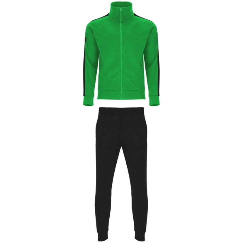 Description Survêtement composé d´une veste et un pantalon:1.Col haut avec bande de propreté intérieur au ton.2. Col, poignets et bas en côte 1x1. 3. Zip central au ton avec tireur.4. Poches laterales des veste avec zip.5. Panneau latérale en contraste.6.Pantalon avec ceinture élastique et cordon de serrage.7. Deux poches laterales.8.Poche arrière avec zip.9. Bas avec élastique en côte 1x1. |
