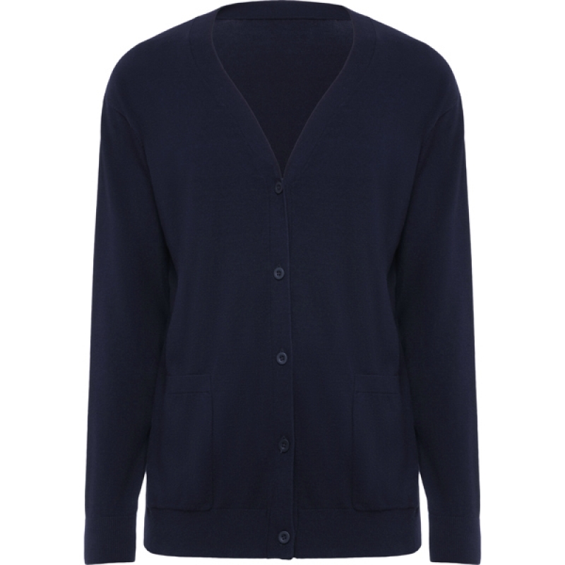 Description Veste col V pour femme. · Tissu en tricot doux. · Fermeture centrale de cinq boutons au ton. · Deux poches de plaston. · Poignets et taille élastiques en côte 1x1. |