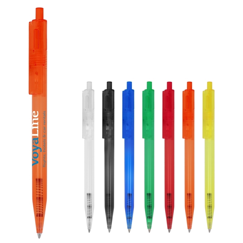 Description Stylo bille design , fabriqué en Allemagne. Couleurs transparentes. Ce stylo possède une recharge X20 en écriture bleue.  |