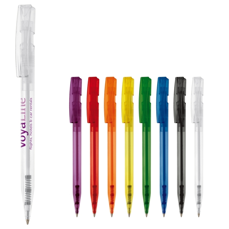 Description Stylo bille plastique designed by avec corps transparent et clip courbé. Cartouche encre bleue X-20. Made in Germany. |