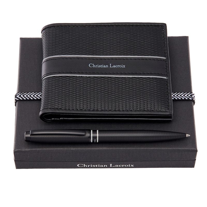 Description Découvrez le Set Caprio Black : un portefeuille élégant et un stylo bille sophistiqué, parfaits pour un style raffiné. L’alliance du cuir noir et du design chic vous accompagne avec classe au quotidien. |