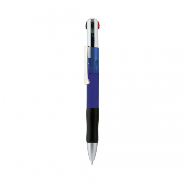 Description Stylo 4 en 1, mécanisme à poussoir rétractable, design classique et corps translucide proposé en couleurs vives. Avec attributs coloris argent et grip ergonomique doux de couleur noire. 4 cartouches : encre bleue, rouge, noire et verte. |