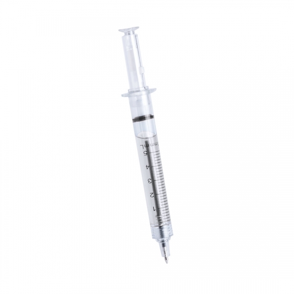 Description Stylo original au design de seringue avec corps transparent. liquide intérieur de couleur vive. Encre bleue.  |