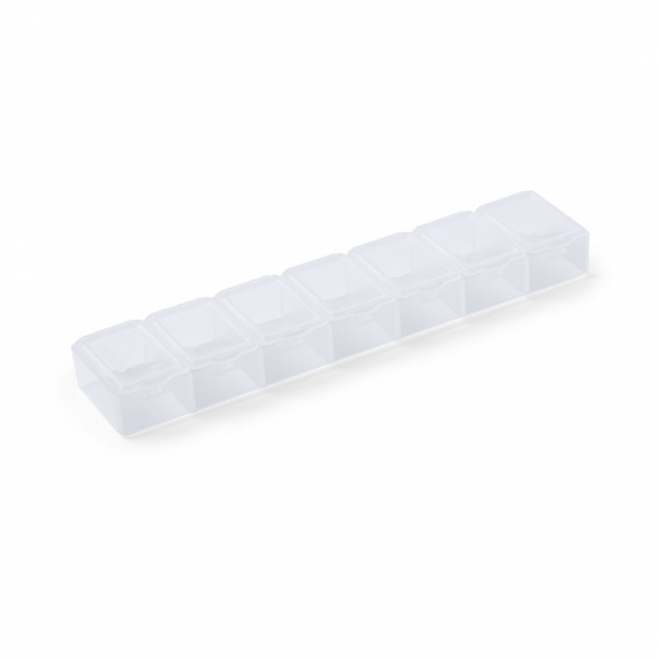 Description Boîte à pilules hebdomadaire translucide et résistante proposée en couleurs vives. 7 compartiments individuels avec fermeture de sécurité. |