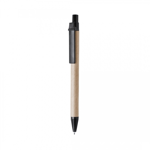 Description Stylo à bille à bouton-poussoir en mélange de carton recyclé couleur naturelle pour le corps et attributs de couleurs vives. Encre noire. |