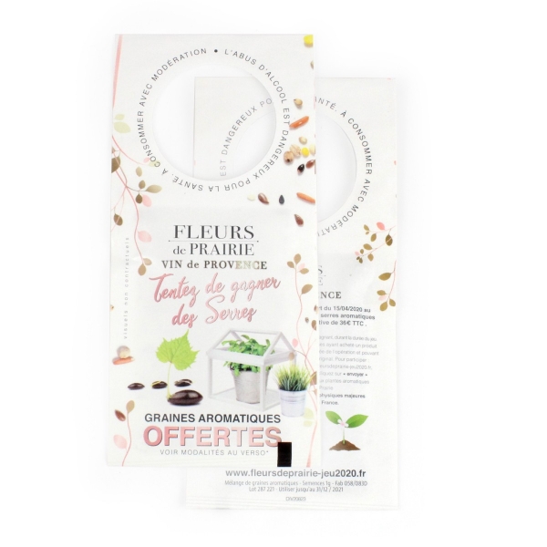 Description Ce sachet de graines avec ouverture Ø37 mm est pensé pour s'accrocher directement au goulot de bouteilles. Personnalisable recto/verso, il permet de transformer un support courant en objet com original à faire pousser. Un format malin pour enrichir l’expérience client. |