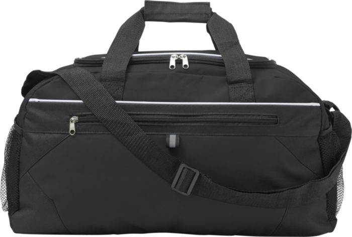 Description Sac de sport en polyester 600D avec poche frontale zippée et poches latérales filet. |