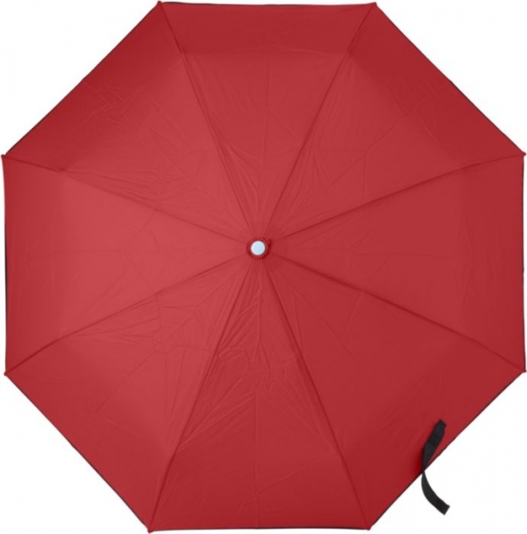 Parapluie pliable en polyester pongée 190T avec fermeture et ouverture automatiques, mât en métal, baleines en aluminium, manche en plastique, livré avec une housse en nylon.