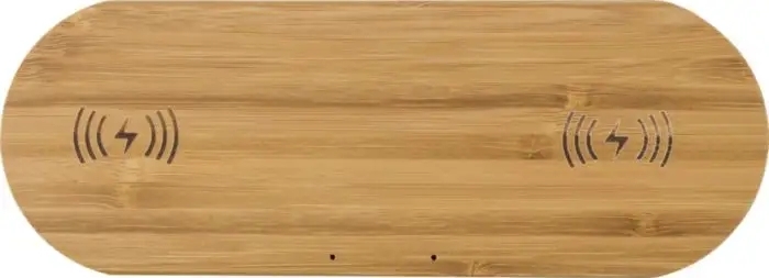 Description Chargeur à induction double en bambou avec entrée 5V-3A et sortie 5V-1A, livré avec câble USB/USB-C. |