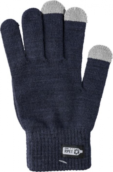 Gants tactiles en rPET avec revêtement conducteur sur trois doigts pour une utilisation sur écran. Étiquette rPET à l’extérieur et étiquette de lavage à l’intérieur.