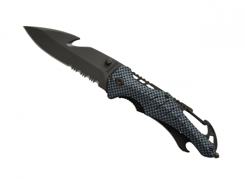 Description Couteau de poche pliant avec lame en acier inoxydable 420 avec revêtement titane composée d'une partie de lame fine (pour les coupes précises) et d'une partie microdentée (pour les coupes difficiles). Manche en aluminium anodisé style fibre de carbone. Ouverture/fermeture une main avec cran de sécurité de type Liner lock. Assemblage vissé Torx. Fonctions coupe-ceinture/coupe-corde sur la lame et marteau brise-vitre en carbure de tungstène à l'arrière du manche. Décapsuleur, mousqueton d'accroche et clip de ceinture. Livré dans un étui gris chiné en RPET. |