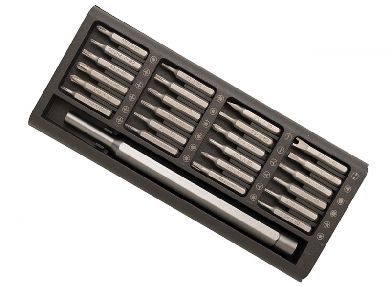 Description Kit de tournevis contenant un manche de tournevis en alliage d'aluminium et 24 embouts différents en acier C45 : 5 x Cruciforme, 8 x Torx, 3 x Tri-Wing, 2 x Plat, 2 Etoile, 2 x Allen, 1 x Triangle et 1 x Spanner (aussi appelé Snake-Eye). Manche du tournevis de 12,5cm de longueur totale avec extrémité aimantée et système de rotation du manche. Maintien des embouts dans le coffret grâce à un système aimanté. Ouverture du coffret par glissement. |