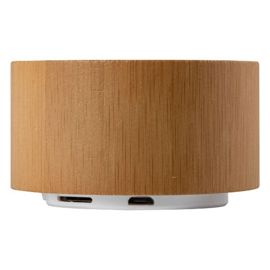 Haut-parleur en bambou et connexion Bluetooth, rechargeable via un câble USB (inclus), alimentation 3 W, fonction mains libres, radio et base antidérapante.